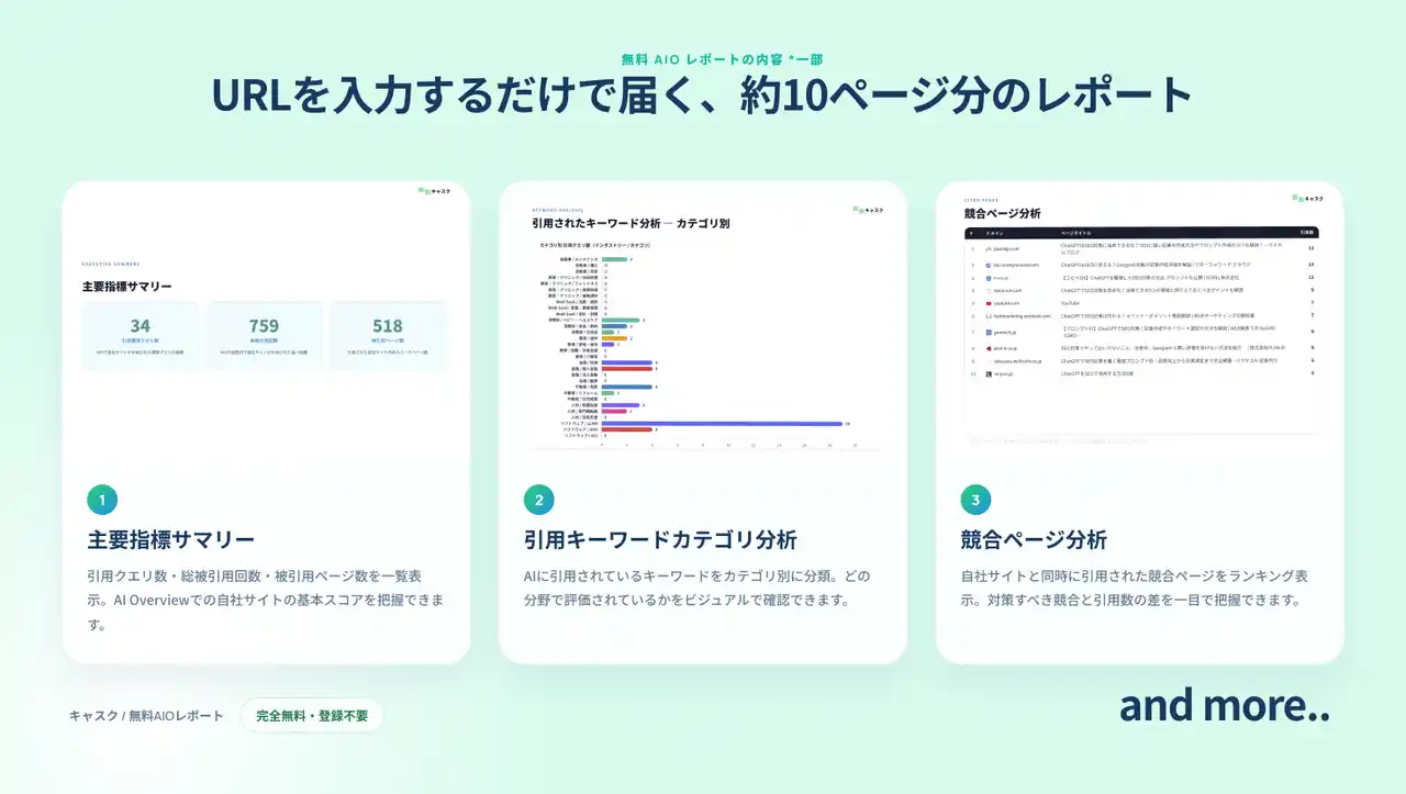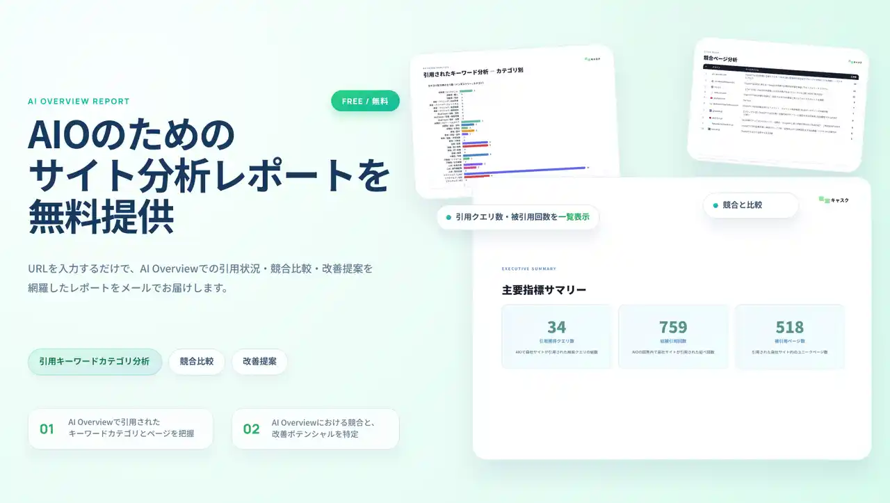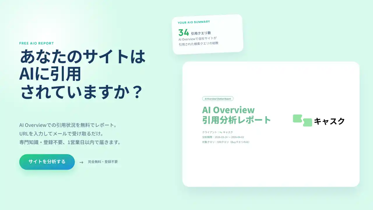 こうした課題に応えるため、キャスクは「URLを入力するだけで誰でも無料で受け取れる」AIOサイト分析レポートの提供を開始しました。 |