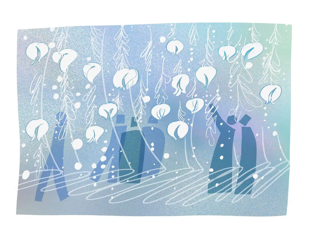 宙を漂う布の間から、ビーズや透明な雫が静かに垂れ下がる。雨の中に佇むような、しっとりとした静けさ。嵐を抜けた先にある、息をつくひととき。 |