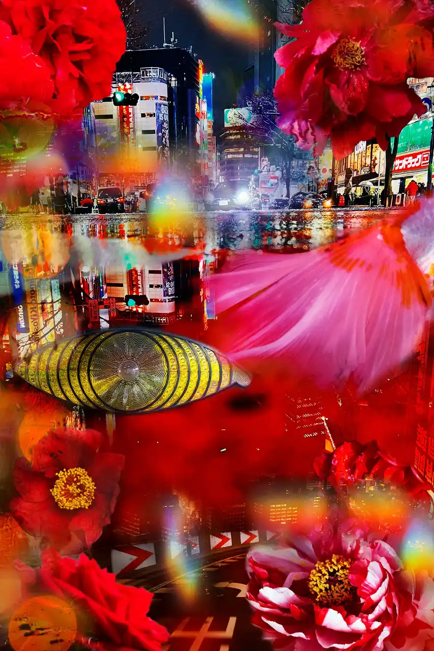 | 東京のような巨大都市は、情報や光が絶え間なく流れ込み、混沌と秩序、生と死がせめぎ合いながら脈動する場所。その深みに目を凝らすと、硬質な構造の内側から、色と光が噴き出すように広がり、やがて花々が咲き満ちてゆく。それは、都市の表層を越えてあふれ出す「いのちの力」の光景。音と光が共鳴するなか、都市は呼吸するようにその表情を変え、静かに観る者を包み込んでいく。終わりと始まりが交差するこの時、都市が再び目覚める気配が満ちてゆく。 | ||||||||||||||||||