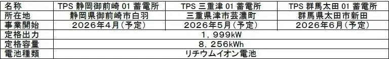 スマート生活ナビゲーターの事業コンセプトのもと、スマートで環境に優しい社会実現に取組む株式会社東急パワーサプライ(本社:東京都世田谷区、社長:御代一秀、以下当社)は、このたび、「創エネ」「蓄エネ」のさらなる拡大を目指し、系統用蓄電所事業に参入し、静岡県御前崎市にて、第1号蓄電所を2026年4月より運転開始いたします。また、同年5月に三重県津市、6月に群馬県太田市にて順次蓄電所の運転を開始する予定です。 |