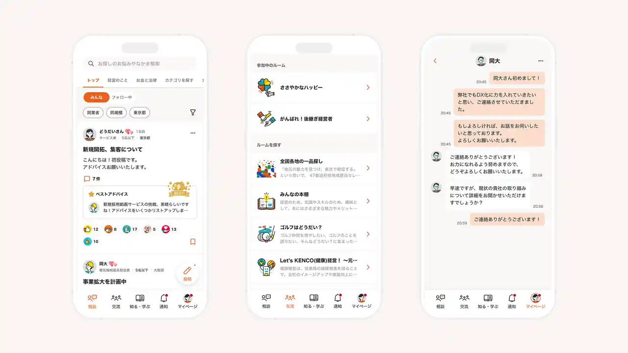 経営者同士のコミュニケーションをより豊かにするため、多彩なリアクション機能や、思いやりが伝わるマイクロインタラクション(アニメーション効果)を実装しました。また、アプリの背景色には柔らかく親しみのある「オレンジ入りのライトグレー」を採用。心理的に明るく温かい環境をつくることで、活発で気軽な交流を後押ししています。 |