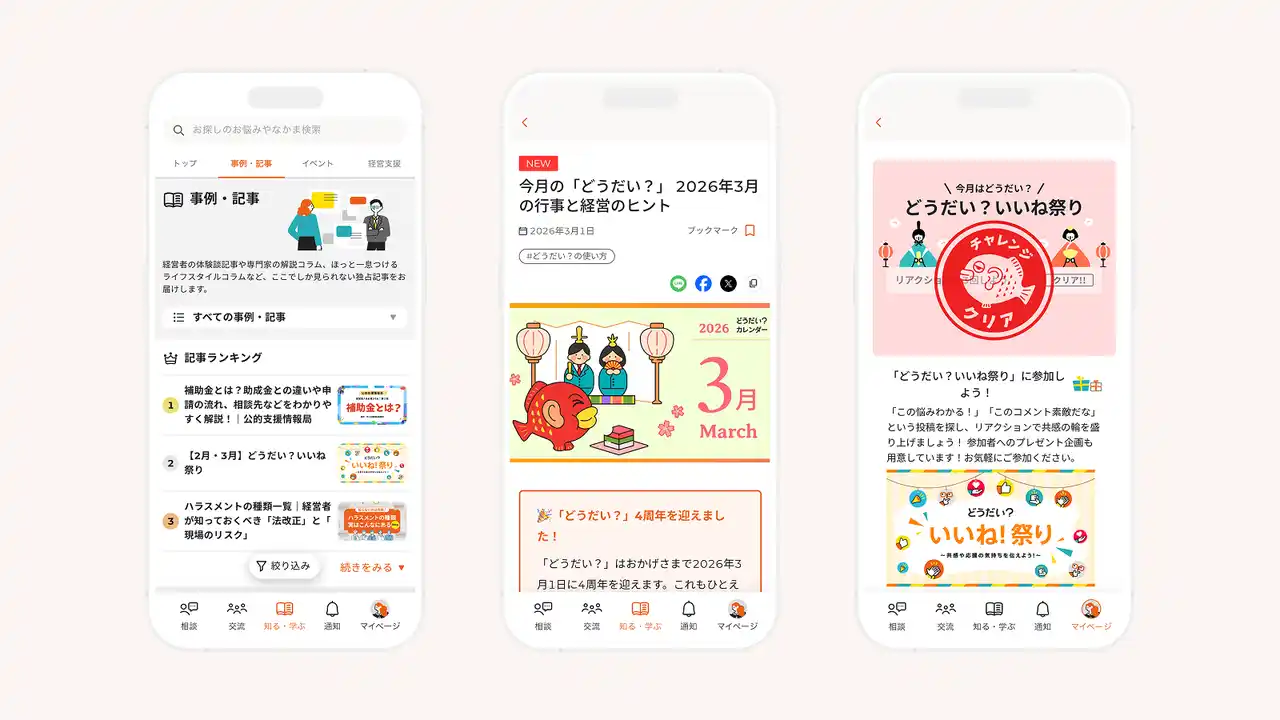 「どうだい?」は、大同生命が保険会社の枠を超え、中小企業経営者の「孤独」や「悩み」を解決するために立ち上げた、国内初(※)の中小企業経営者特化型Webコミュニティです。2026年3月時点で12万人を超える経営者が参加し、経営者同士の相談や交流、最新の経営情報の収集が活発に行われています。 |