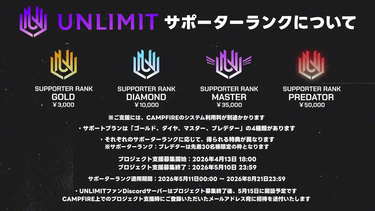 | 本プロジェクトでは、Discordサーバーを中心に、支援者限定の情報発信や各種コンテンツ提供を行うほか、サポーターランクに応じて、選手からのデジタルメッセージ、秘蔵映像、オンラインミート&グリート、カスタムマッチ、応援配信イベント、ファンイベント、グッズ関連特典など、さまざまな体験を用意しています。応援を“実感”へと変え、ファンの皆さまにUNLIMITの内側からYear6 Split1をともに戦っていただくことを目指します。 | ||||||||||||||||||||||||||||||||||||