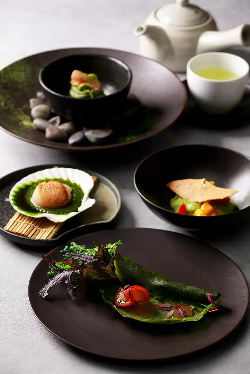 アペタイザー:はかた極味鴨の和紅茶マリネ / 八女よもぎのサラダクレープ / 八女煎茶でマリネした中トロの炙り / 北海道産帆立のソテー 八女茶とバジルのソース |