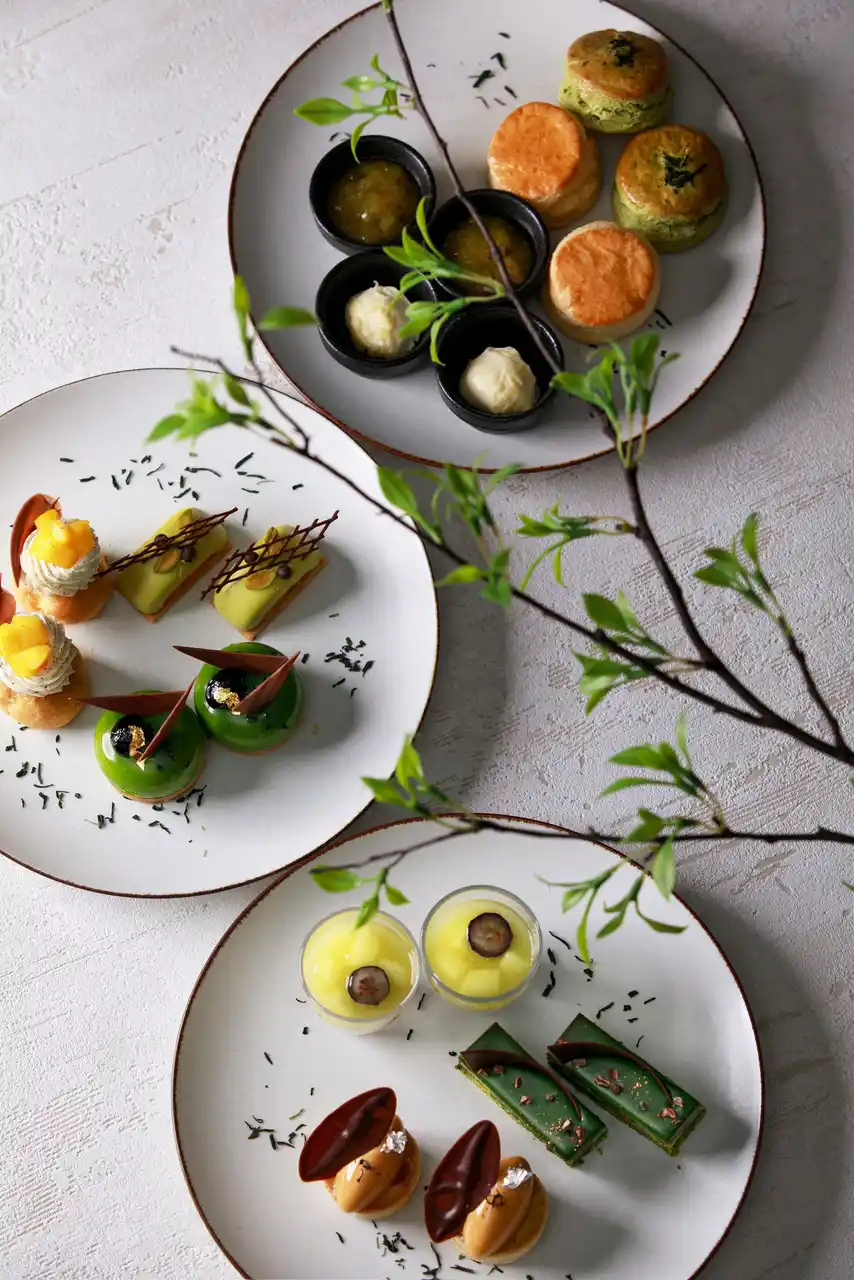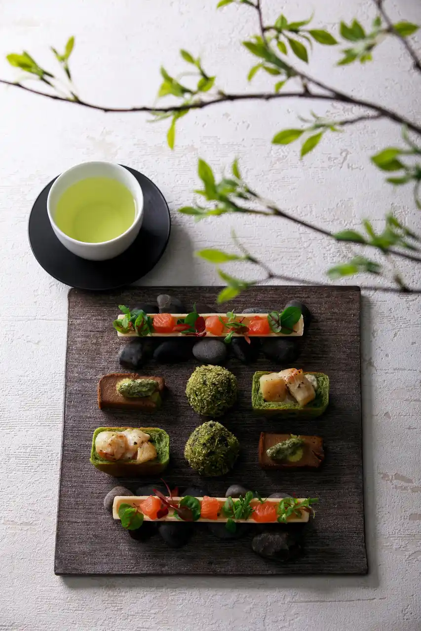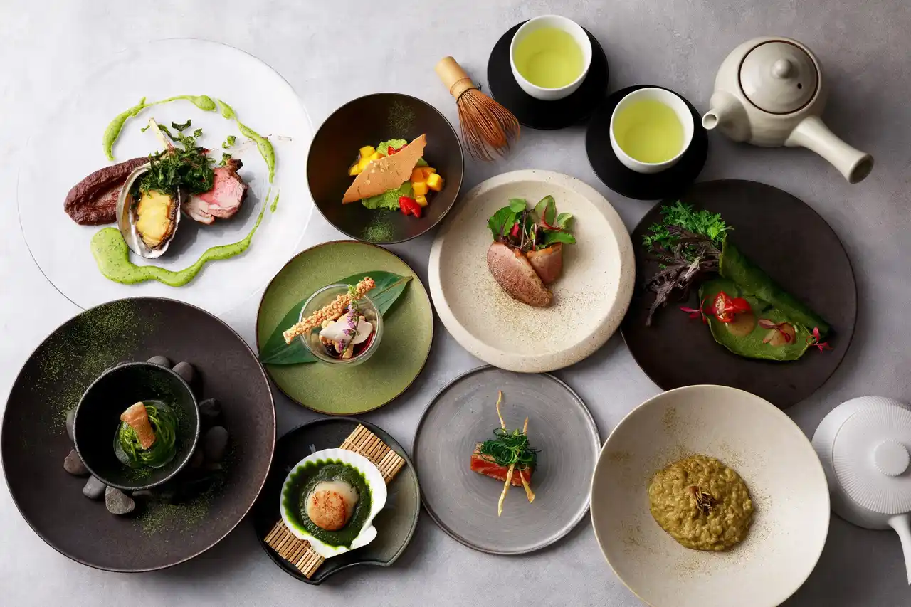 ホテル開業30周年を迎える2026年、好きな組み合わせで好きなだけ楽しめることで人気のシグネチャービュッフェ「ディナーオーダービュッフェ」は、2か月ごとのテーマ制で展開しております。5月・6月は約40種類の既存メニューに加え、中村園の八女茶を使用した新作料理およびデザートを9種類追加し、より一層充実した内容でご提供します。本フェアでは、八女茶の個性を軸に、フレンチやイタリアンの技法に和のエッセンスを融合させ、視覚・味覚・嗅覚のすべてで楽しめる料理体験を創出します。 |