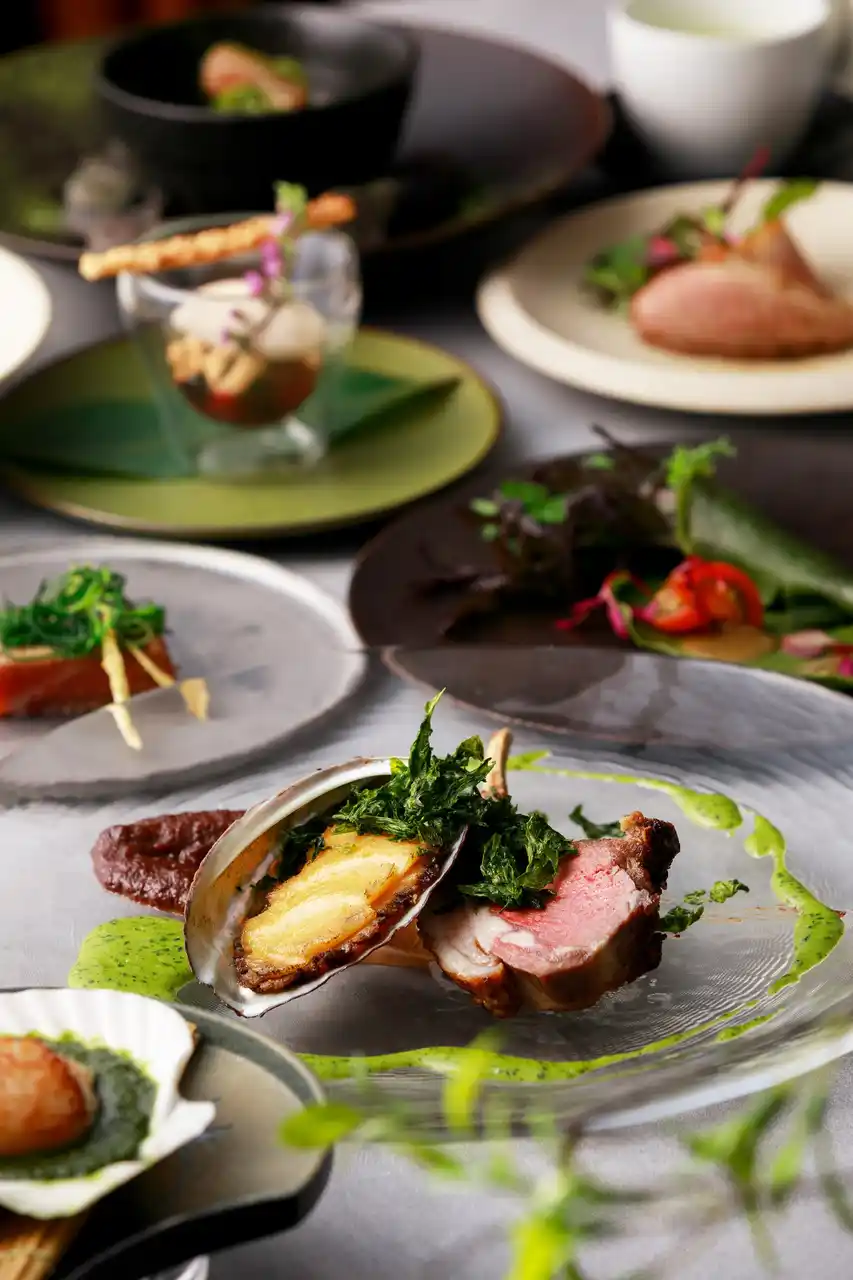 メインディッシュ:オーストラリア産ロアリング・フォーティーズ ラムのグリルと玄界灘産鮑のスービット 八女玉露のソース |