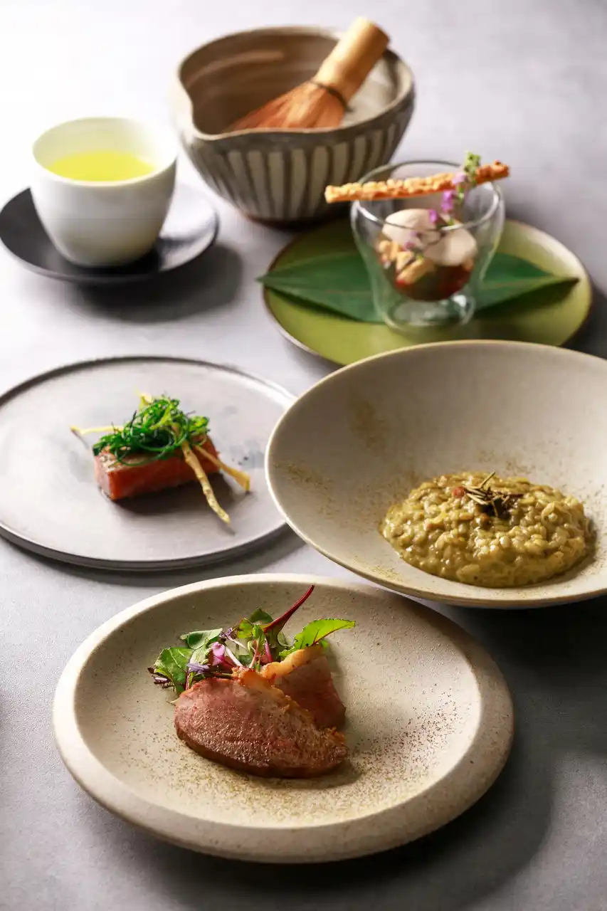 パスタ&リゾット:八女抹茶の冷製カッペリーニ / 八女ほうじ茶のリゾット |