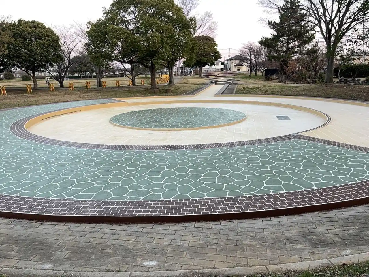 ステンシル目地と多彩なカラーによりデザイン性を高めた広場 |