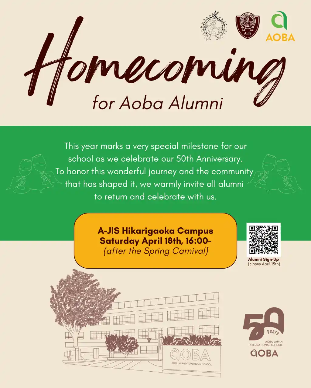 株式会社Aoba-BBT(所在地:東京都千代田区、代表取締役:柴田巌、以下「Aoba-BBT」)のグループ会社が運営するアオバジャパン・インターナショナルスクール(以下「A-JIS」)は、2026年に創立50周年を迎えます。 |