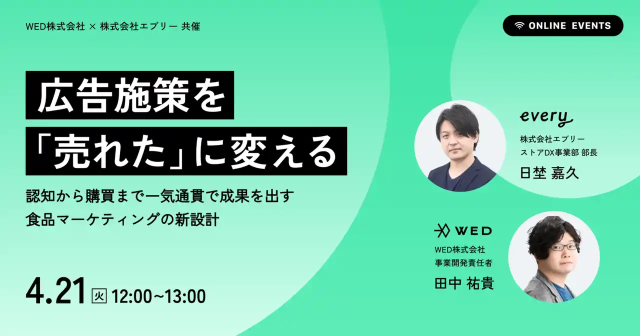 WED株式会社(本社:東京都渋谷区、代表取締役:新井 俊樹)は、株式会社エブリーが運営するレシピ動画メディア『デリッシュキッチン』と共同で、食品・飲料メーカーのマーケティング・営業企画担当者を対象としたウェビナーを2026年4月21日(火)12時より開催します。 |