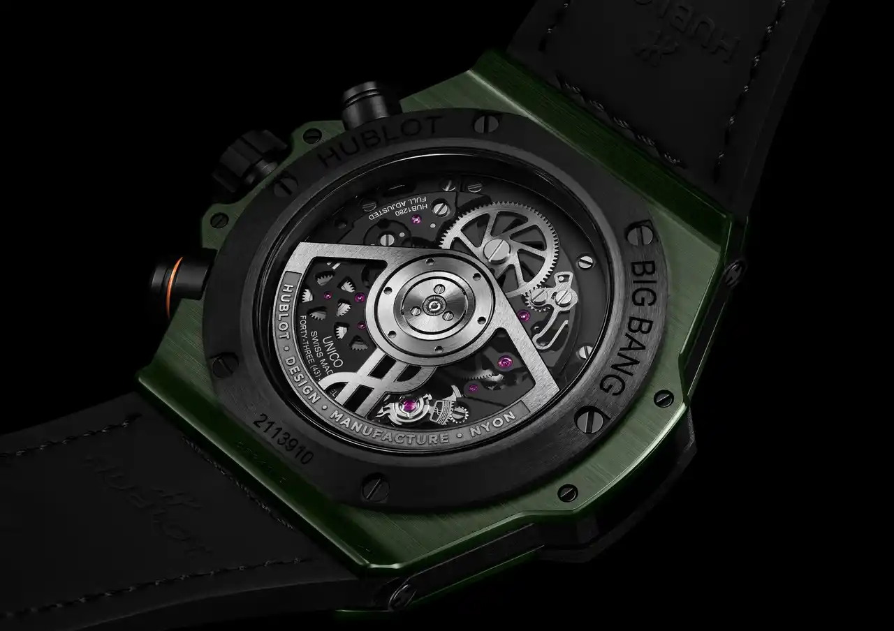 加えて、ブルーとダークグリーンのモデルには、従来のセラミックよりも300ビッカース高い硬度を誇る、ウブロのフルカラーハイテクセラミックが採用され、その高い技術力を体現しています。5つ目のモデルは、チタニウムとブラックセラミックを融合させたモデルです。軽量な航空宇宙グレードのチタニウムとテクニカルセラミックを組み合わせることで、高い耐久性を確保しています。また、2013年に発売された初代「ビッグ・バン ウニコ」と同様に、チタニウム製のベゼルとケースにブラックセラミックのケースバックを組み合わせ、卓越した堅牢性を実現しています。 |