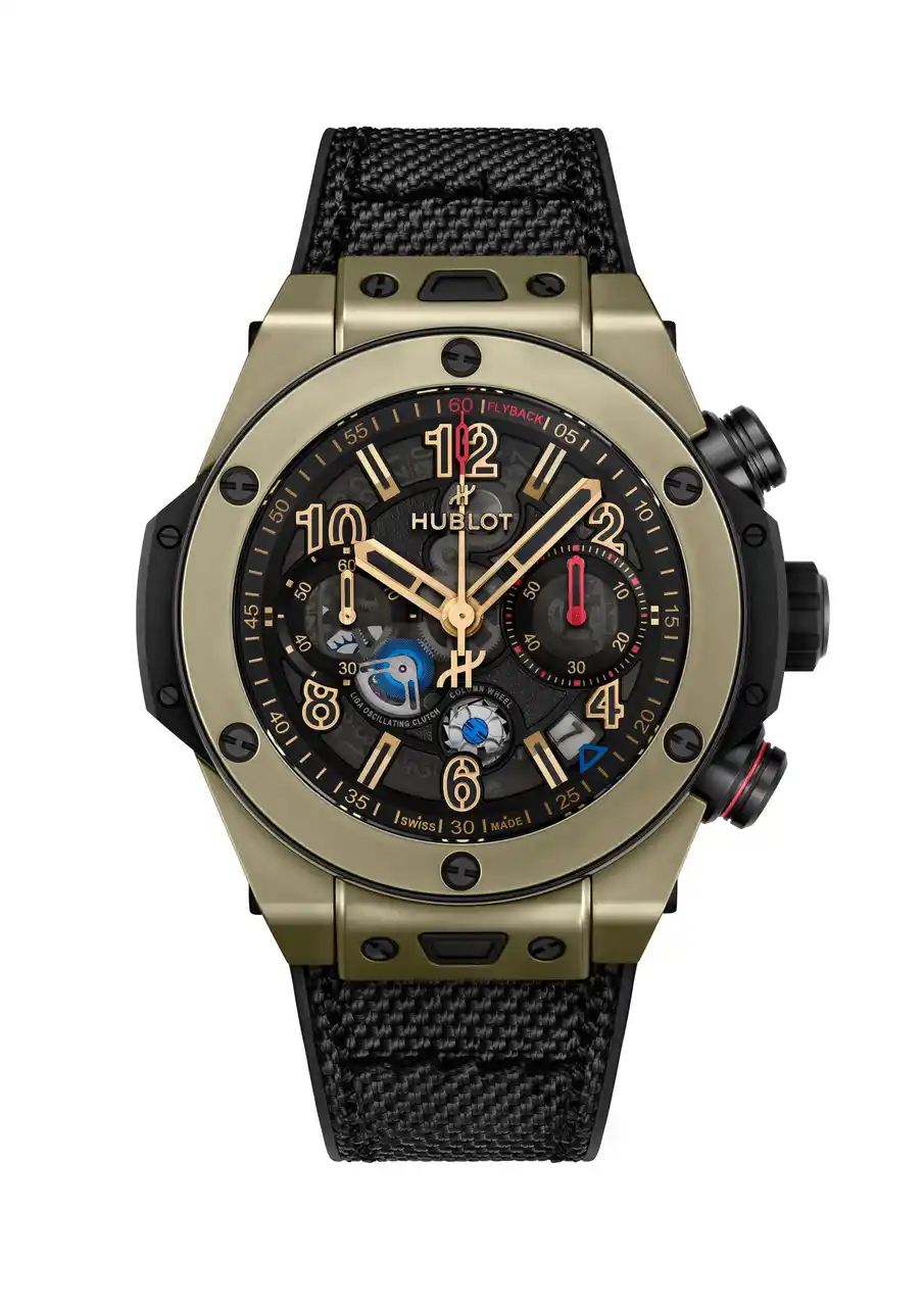 クロノグラフ機能も際立っており、4時位置のプッシュピースに施されたカラーリング、刷新された3時位置の分針、フライバックの刻印、そして4時と5時の間に再配置された日付表示が採用されています。ケースバックには、新しいオープンワークのローターに、切り抜かれたHの文字と「Hublot. Design. Manufacture.