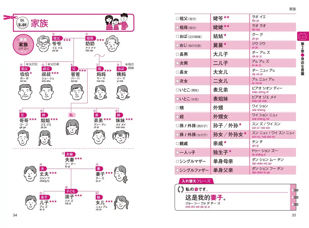 第1章 基本表現 第2章 身近な言葉 第3章 時間・場所 第4章 食 第5章 生活 第6章 学校・社会 第7章 趣味 第8章 旅行・その他 第9章 緊急時 第10章 中国語の基本 |