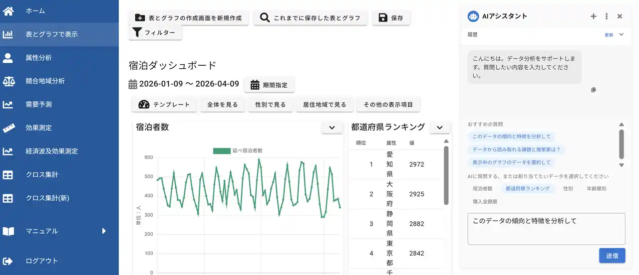 ユーザーが現在閲覧している画面のデータを自動的にコンテキストとして取得します。「このデータから改善すべき点を教えて」と入力するだけで、AIが表示中の宿泊者数や消費額などの数値を踏まえた具体的な回答を返します。わざわざデータをコピーして貼り付ける手間はありません。 |