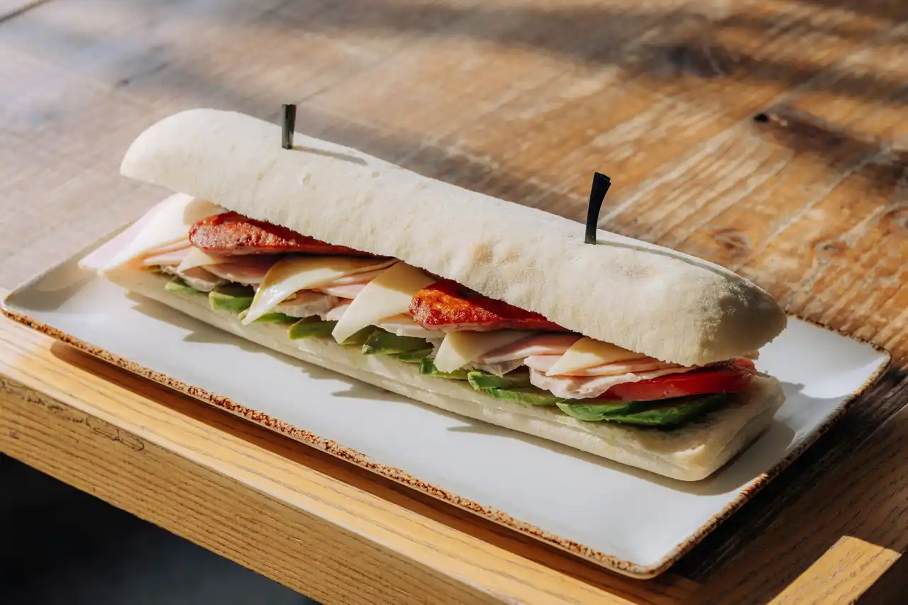 カリッとした食感のパン「ビローテ」に、ポークやチキン、パネラチーズを挟み、温かくスパイシーなトマトベースのソースをたっぷりとかけた“浸す”スタイルのサンドイッチ。 |
