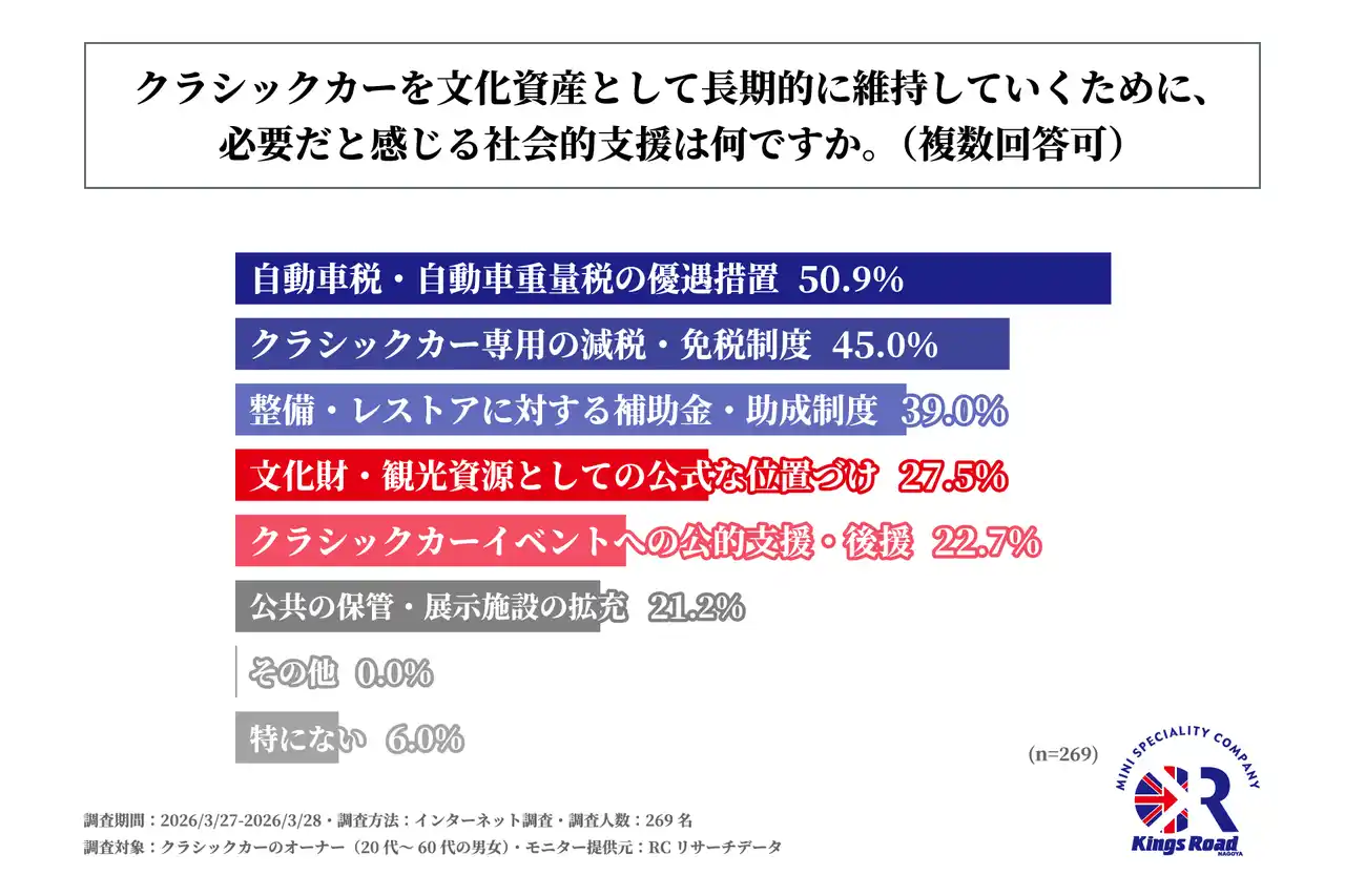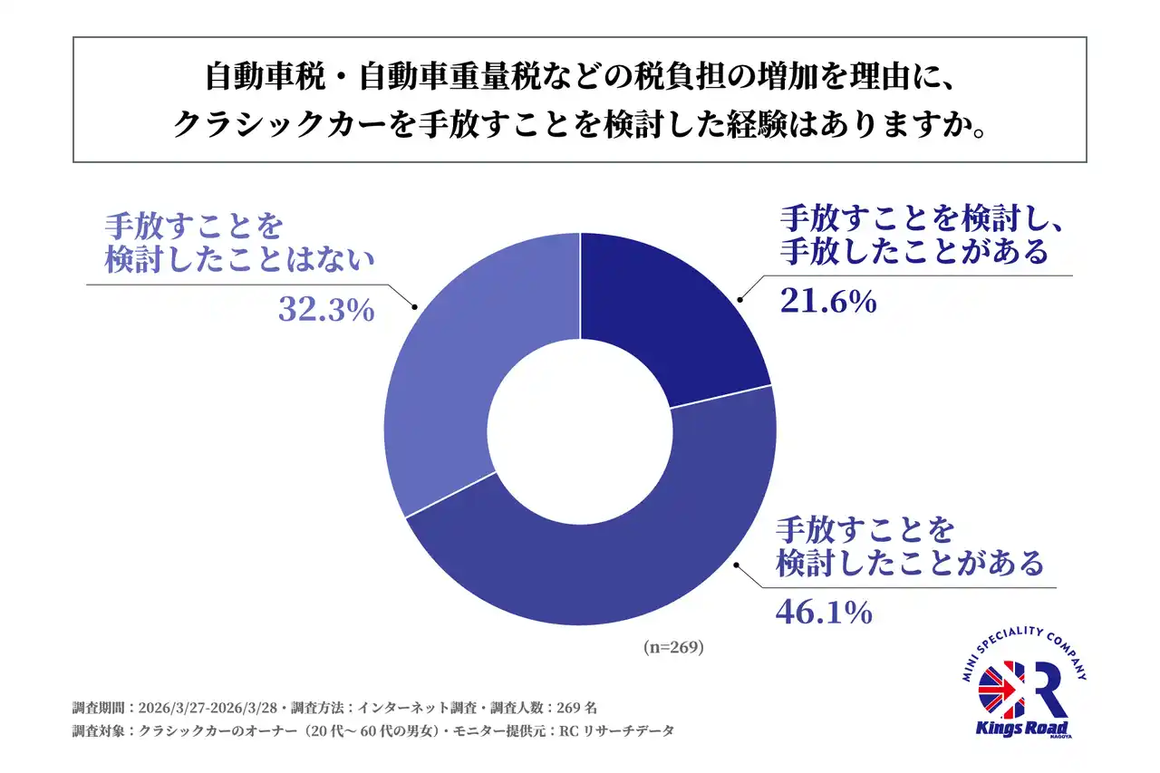 ローバーミニ専門店「キングスロード名古屋」を運営する有限会社キングスロード(本社:愛知県小牧市、代表者:後藤 一義)は、クラシックカーのオーナー(20代~60代の男女)を対象に「経年車重課によるクラシックカー保有継続への影響に関する調査」を実施しました。この調査から、クラシックカーのオーナーの経年車重課に対する負担感や、税負担が今後の保有継続に与える影響、そしてクラシックカーを文化資産として維持していくために求める社会的支援などが明らかになりました。
