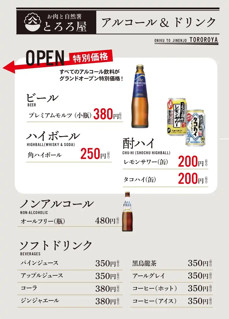 | さらに、アルコール各種もオープン特別価格にてご用意しております。 | ||||||||||||||