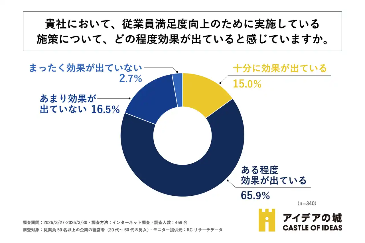 従業員満足度向上に関する具体的な取り組みを実施している従業員50名以上の企業の85%以上が、自社の従業員満足度向上のための施策について、十分な効果は出ていないと感じている |