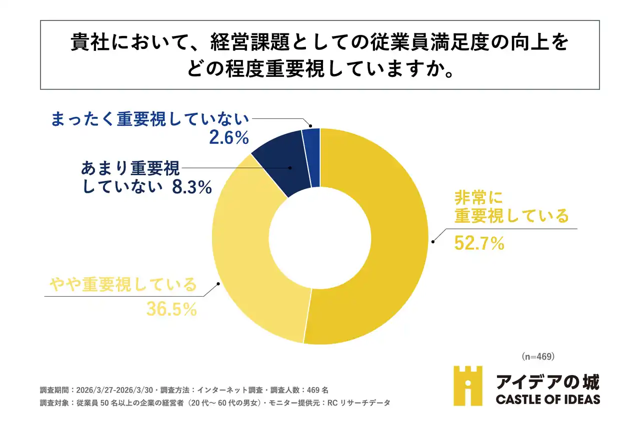 従業員50名以上の企業の約9割が、経営課題として従業員満足度の向上を重要視している |