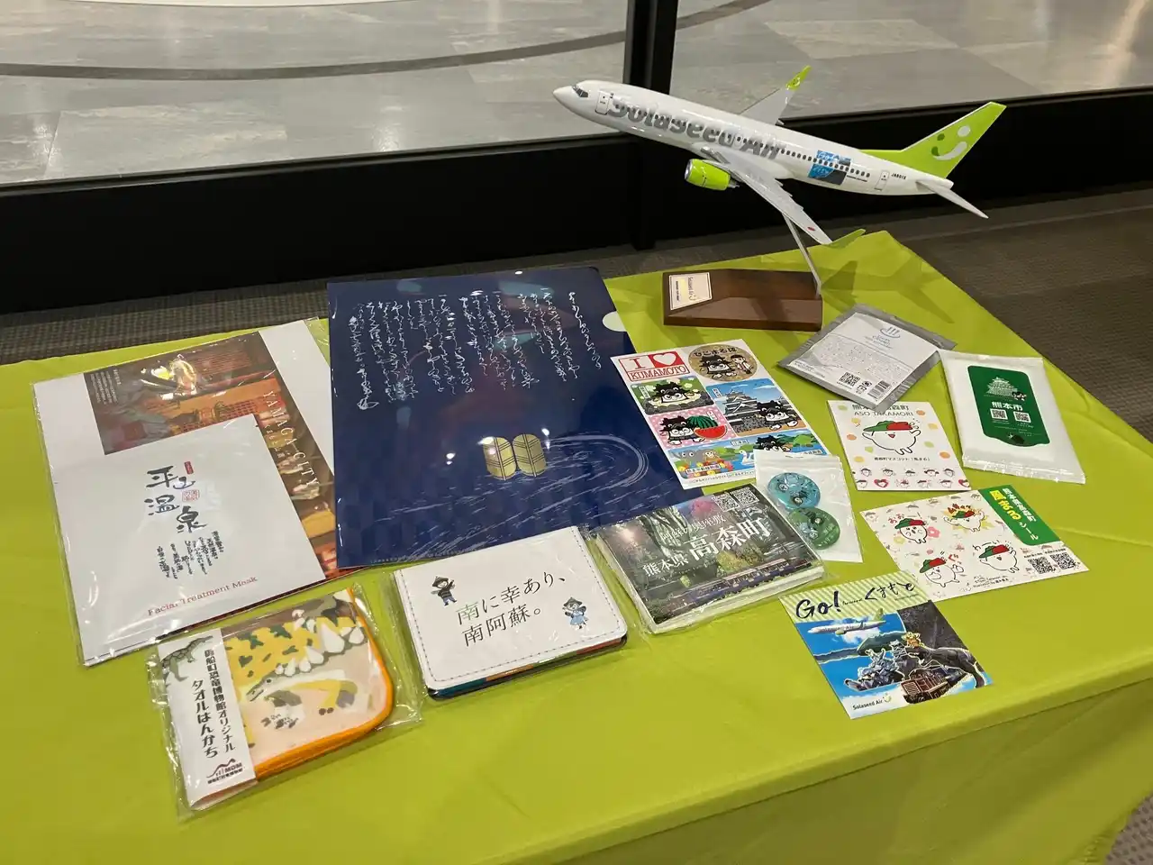 就航日当日、ソラシドエア16便〔熊本発 東京(羽田)行き〕の 『Go!forward くまもと号』にご搭乗いただいたお客さまに、本プロジェクトに参画をしている6市町村およびソラシドエアのオリジナルグッズや観光パンフレット等の記念品を配付しました。 |