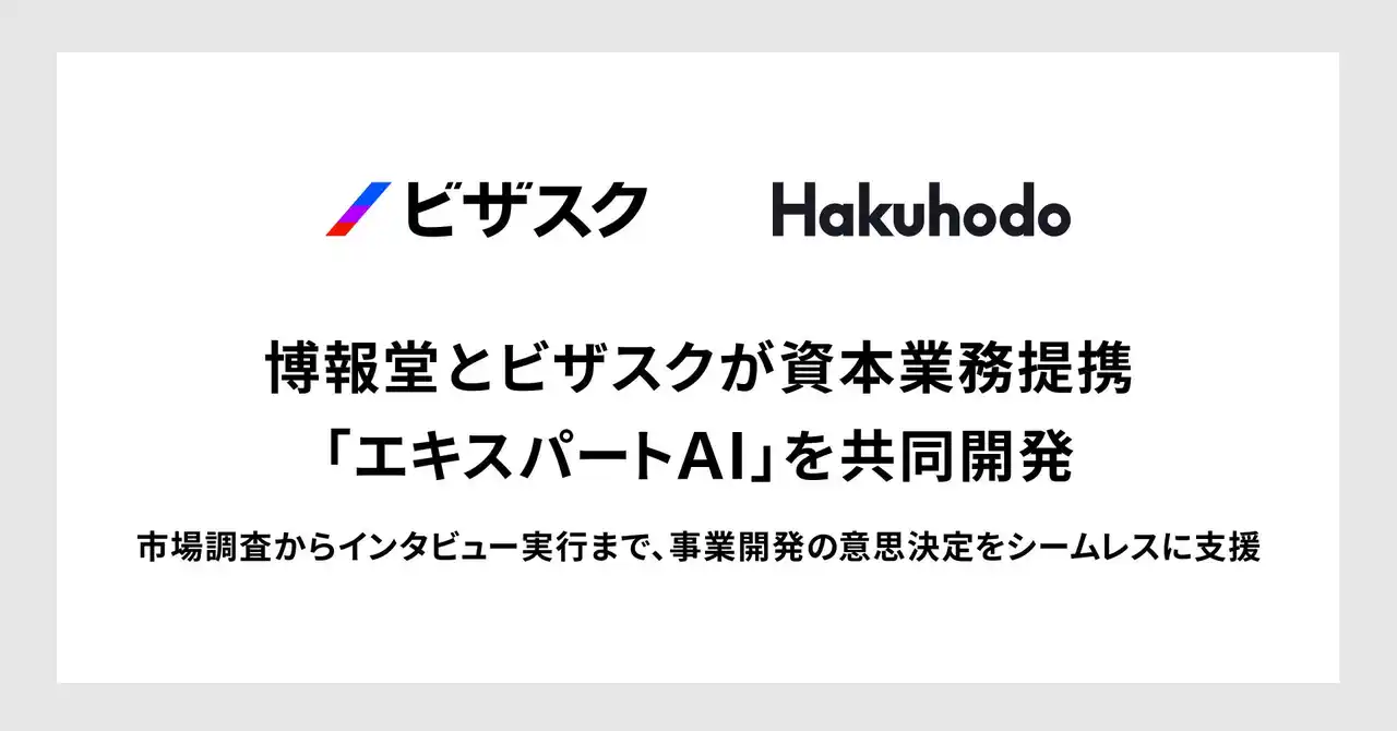 株式会社博報堂(本社:東京都港区、代表取締役社長:名倉 健司、以下 博報堂)とグローバルなナレッジプラットフォームを運営する株式会社ビザスク(本社:東京都目黒区、代表取締役CEO:端羽 英子、以下 ビザスク)は、4月14日付けで資本業務提携契約を締結しました。