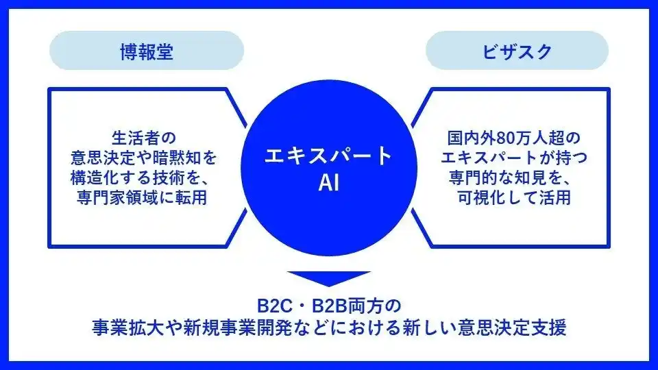 このたびの資本業務提携では、新規事業開発や市場参入・マーケティング戦略立案に取り組む企業の担当者に向けて、ビザスクのエキスパートが持つ業界特有の常識や視点と、博報堂が培ってきた意思決定の思考構造化のノウハウおよびAIエンジンを組み合わせたAIサービス「エキスパートAI」を共同開発します。 |