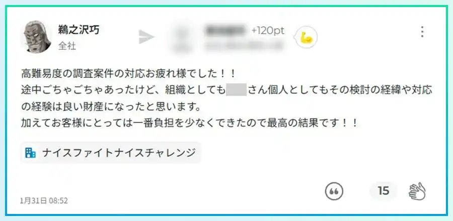 確定申告等の繁忙期、現場のスタッフは膨大なタスクに追われます。通常、上司から称賛や激励のメッセージが届くと「すぐに返信しなければ」という心理的負担(返信コスト)が発生しがちですが、Uniposには返信機能がないため、受け取った側は純粋に喜びや承認を享受するだけで完結します。 |