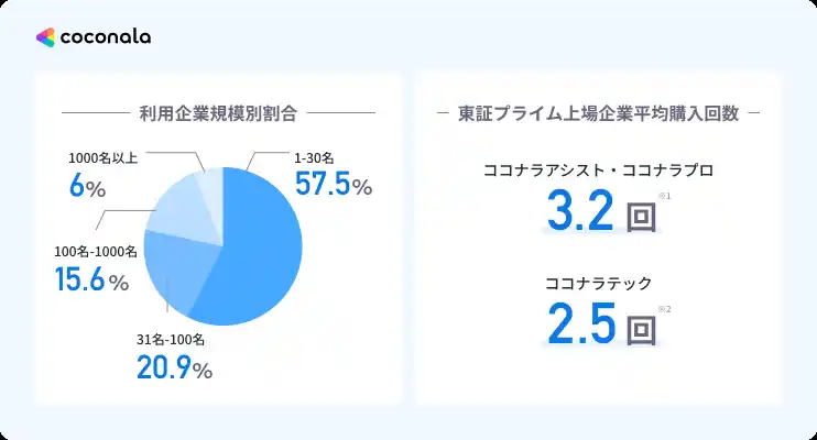 一方、大企業における活用も積極的に進んでいます。東証プライム上場企業の平均購入回数は、『ココナラアシスト』『ココナラプロ』で平均3.2回、『ココナラテック』では、平均2.5回に達しました。単発での利用に留まらず、複数回の活用が加速してきています。 |