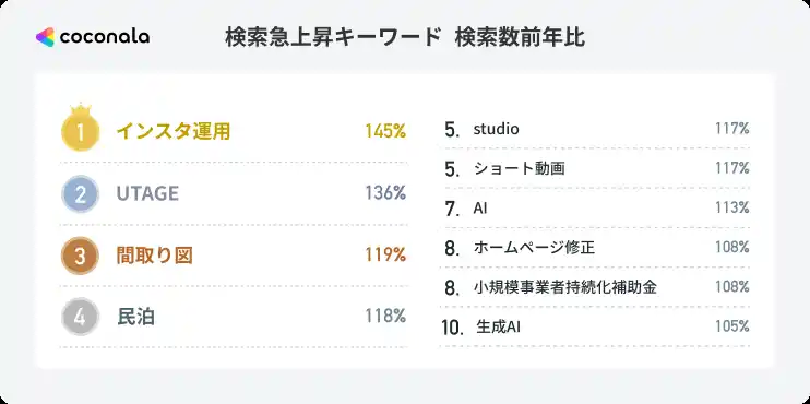 『ココナラスキルマーケット』において、検索キーワードでは「インスタ運用(145%増)」が伸長。特定のITツール名での検索も急上昇している。また、「補助金」や「営業代行」の検索も拡大。 |