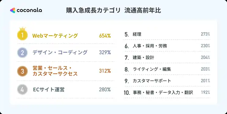『ココナラアシスト』において、前年比で最も高い成長を遂げたのは、「Webマーケティング(654%)」、次いで「デザイン・コーディング(329%)」となりました。 |