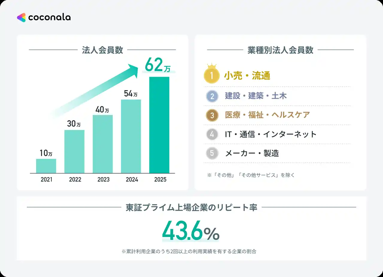 『ココナラスキルマーケット』のビジネス目的での登録アカウントは62万件を突破し、スタートアップから大手企業まで幅広く活用が進む。東証プライム上場企業の約4割がリピート利用しており、外部人材の活用が一過性ではなく、経営の定常的な手段として定着しつつあることがうかがえる。 |