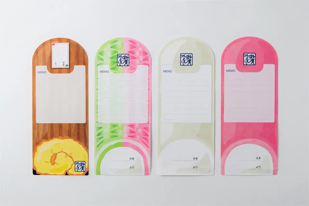 鈴廣の定番商品である「超特選蒲鉾 古今(紅白)・鹿の子」「超特選伊達巻 古黄」をデザインに取り入れ、見て楽しく、使って便利な遊び心あふれるアイテムに仕上げました。お土産に添えるひとことや、ちょっとしたコミュニケーションにも活躍します。 |