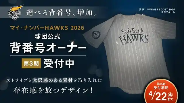 鷹祭SUMMER BOOST 2026 ユニフォームにあなただけの背番号を!マイ・ナンバーHAWKS 2026第3期のオーナー様を募集いたします。 |