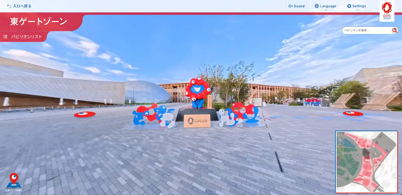 | ・360度動画の統合:パビリオンの入口等に設置されたアイコンをクリックすると、360度動画が視聴でき、展示内容をより深く体験することが可能。 | |||