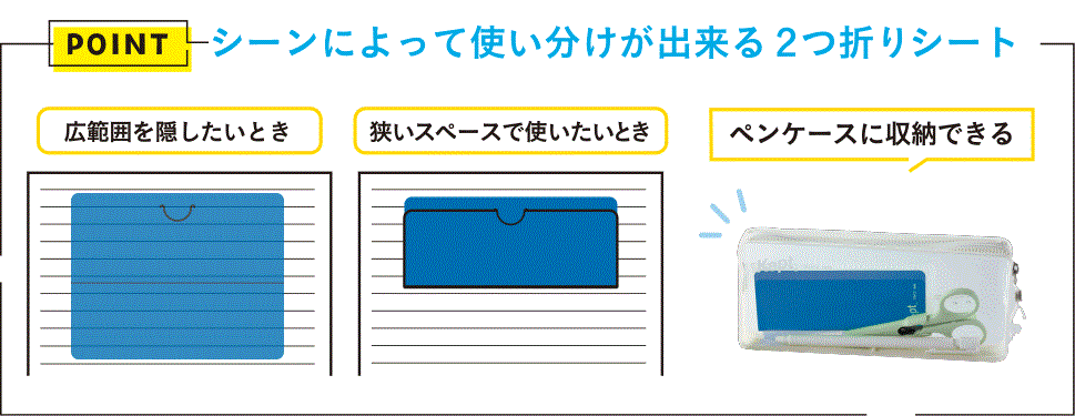 用途によって使い分けができる2つ折りシートとなっています。また、ケース付きなのでペンケースに入れて管理することができます。 |