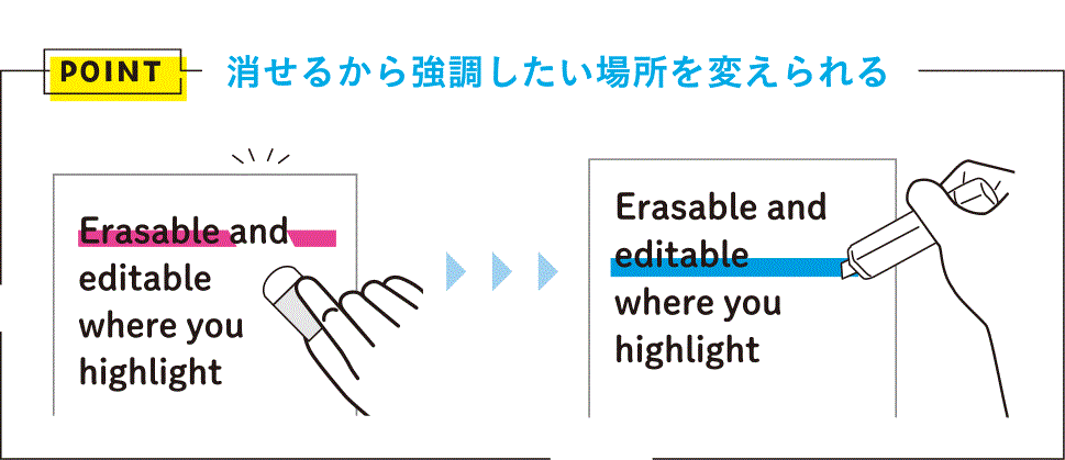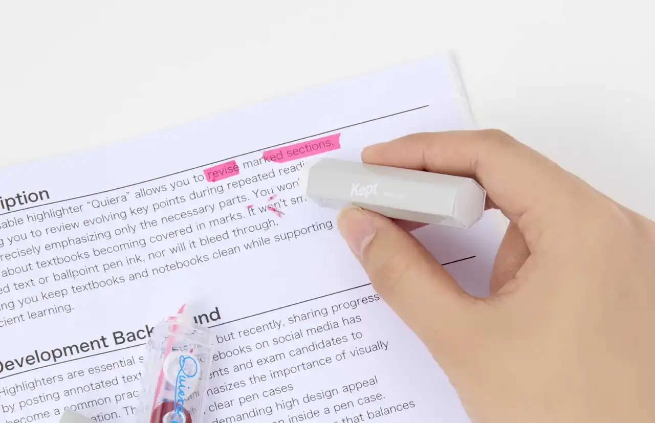 「Keptキエラ」は、消しゴムで消せるテープタイプのラインマーカーです。マーキング後でも簡単に修正が可能なため、覚えた箇所を消したり、強調位置を変更したりと、学習状況やシーンに合わせて柔軟に活用できます。 |