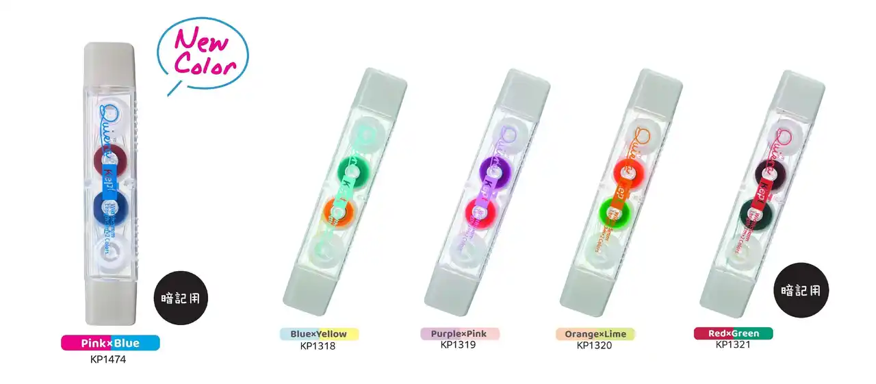 展開中の「ブルー&イエロー」「パープル&ピンク」「オレンジ&ライム」に加え、暗記学習向けの「レッド&グリーン」を合わせた、全5種類(各2色のツインタイプ)のラインアップとなります。 |