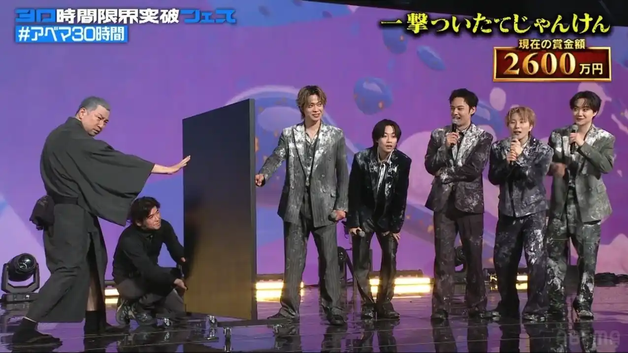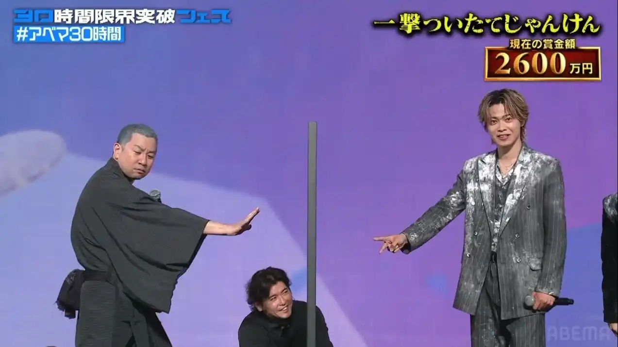 過酷なミッションの連続で賞金が減額されていく中、この時点でコムドットに残された賞金は2600万円。ステージ上では、グランドフィナーレを飾る最後の企画「一撃ついたてじゃんけん」のルールが説明されました。コムドットの代表者1人と芸人チームの対戦相手がついたて越しに一発勝負のじゃんけんを行うという究極の心理戦。1分間であれば出した手を変えることが可能ですが、勝てば賞金2600万円を全額獲得、負ければ0円となってしまいます。さらに芸人チームが勝った場合、賞金100万円を芸人チームも獲得できるというルールが明かされました。 |