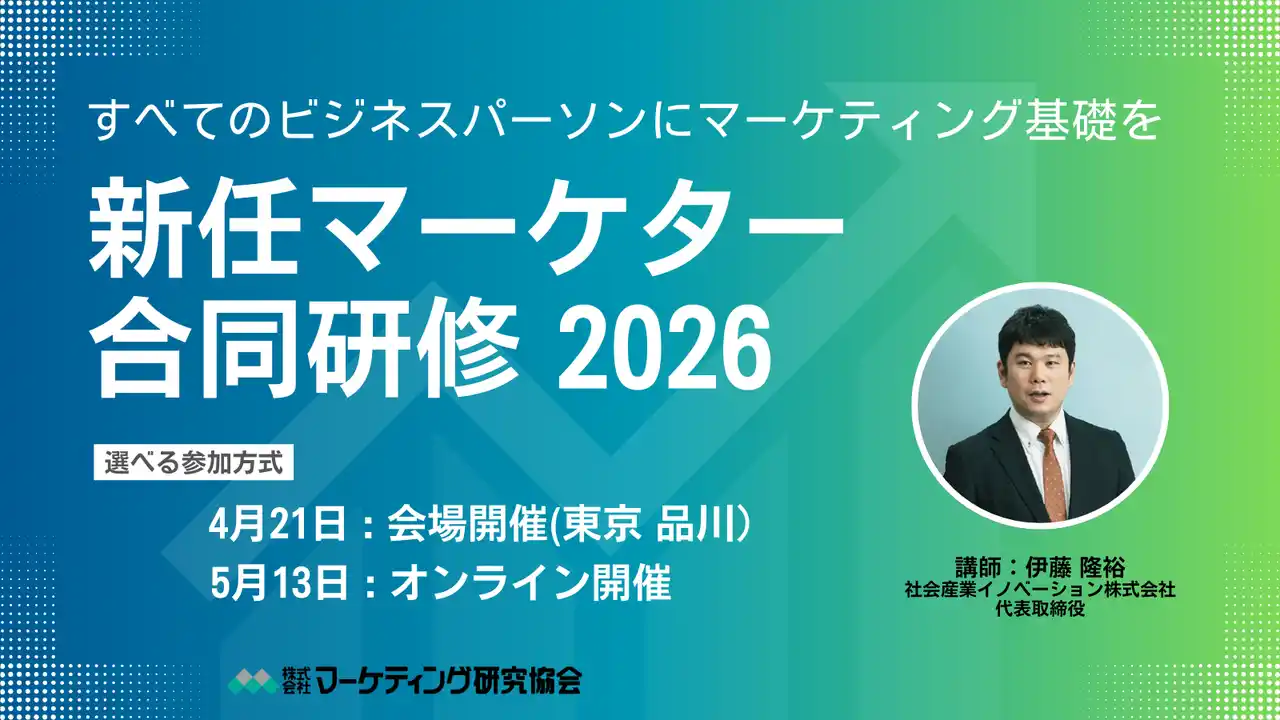 | 株式会社マーケティング研究協会は2026年5月13日オンラインセミナー「新任マーケター合同研修 2026」を開催します。※4月に同一の内容にて「会場集合型」の開催もございます。 |