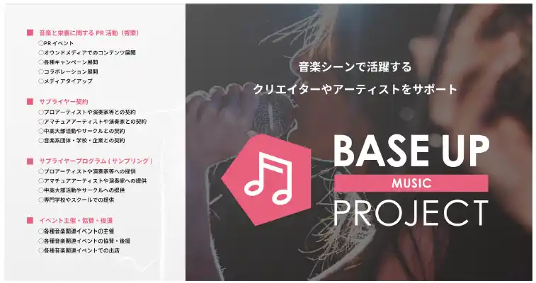 <音楽活動に取り組むアーティスト/演奏家・団体に向けた「BASE UP MUSIC サプライヤー契約・プログラム」参加者募集> |