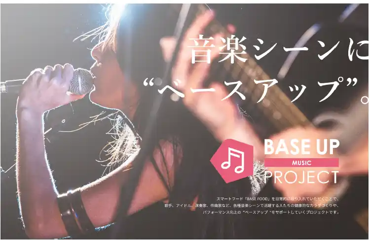 スマートフード完全栄養食である「BASE FOOD」を日常的に取り入れていただくことで、歌手、アイドル、演奏家、作曲家など、各種音楽シーンで活躍する人たちの健康的なカラダづくりや、パフォーマンス向上の“ベースアップ“をサポートしていくプロジェクトです。 |