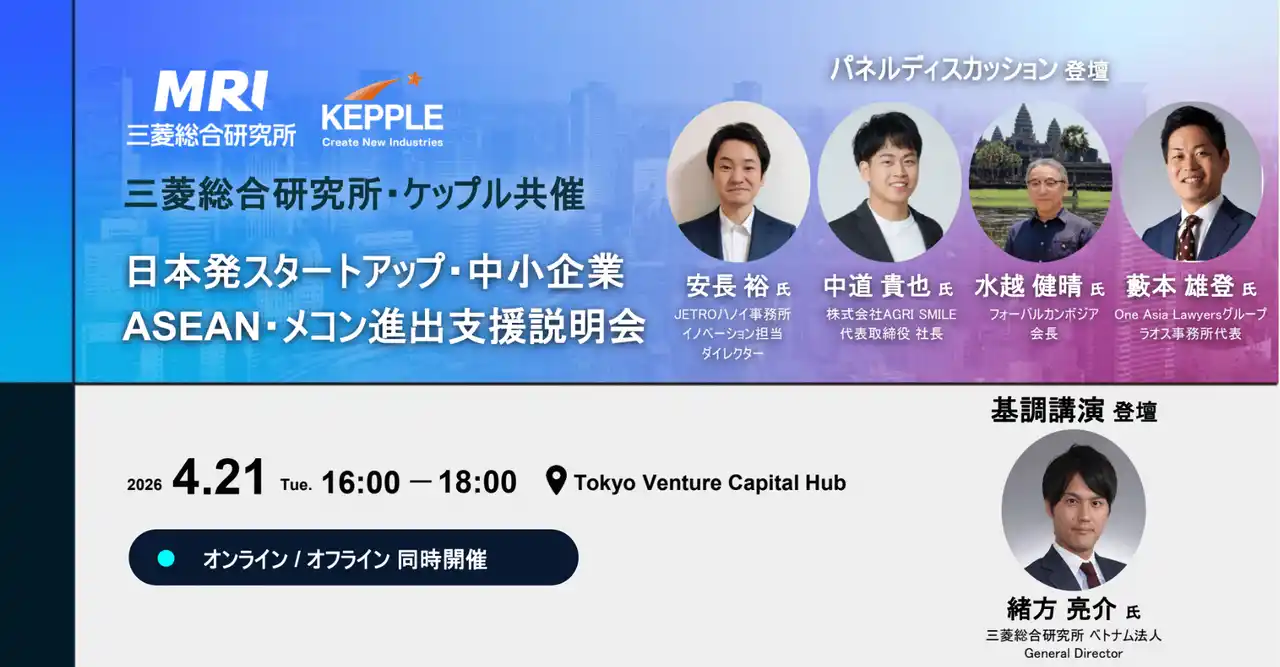 | 株式会社三菱総合研究所(本社:東京都、以下MRI)と株式会社ケップル(本社:東京都)は、2026年4月21日(火)、日本発スタートアップおよび中小企業のASEAN・メコン地域への進出を支援する説明会を開催いたします。 | |||