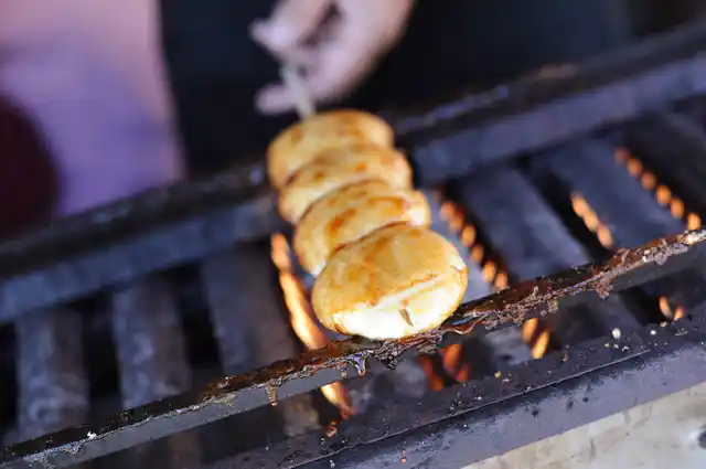 群馬県の郷土の味「焼きまんじゅう」は、ふんわりとした白い生地に、甘辛い濃厚な味噌だれを塗り、香ばしく焼き上げた料理です。 |