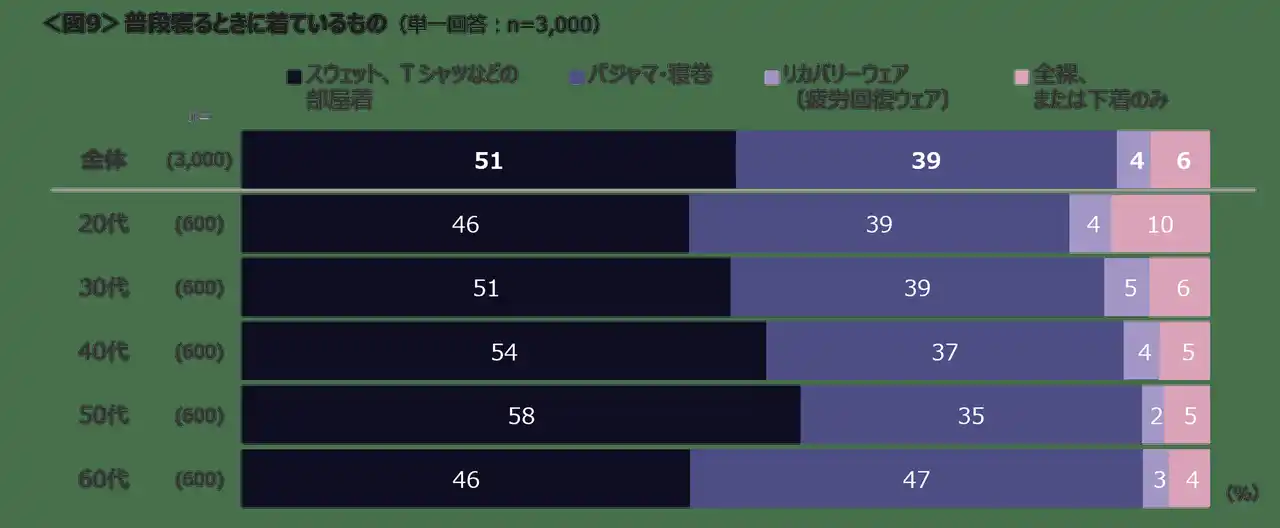 普段寝るときに着用しているものは、「スウェット、Tシャツなどの部屋着」51%、「パジャマ・寝巻」39%。60代のみ「パジャマ・寝巻」が多い。2025年に話題となった「リカバリーウエア」は4%にとどまる。<図9> |