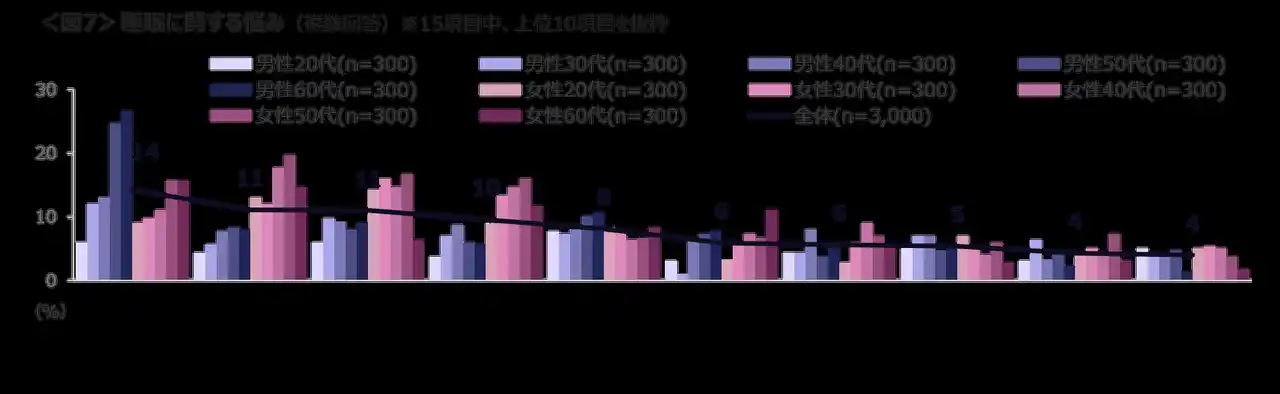 睡眠時の悩みごとは、「いびき」「手足・身体の冷え/手足のしびれ」「歯ぎしり」がTOP3。男性50~60代の「いびき」、女性40~60代は「手足・身体の冷え/手足のしびれ」、女性20~50代の「歯ぎしり」が悩みとして多い。<図7> |