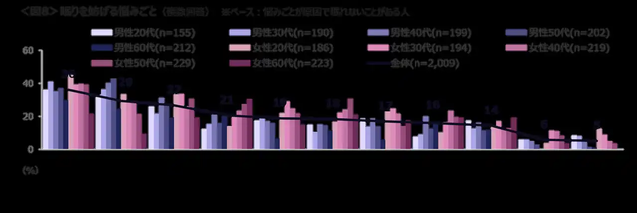 悩みごとが原因で眠れない人の眠りを妨げる悩みごとは、「お金・収入・貯金」「学校や仕事」「人間関係」がTOP3。「お金・収入・貯金」「人間関係」は女性で、「学校や仕事」は男性の割合が高い。<図8> |