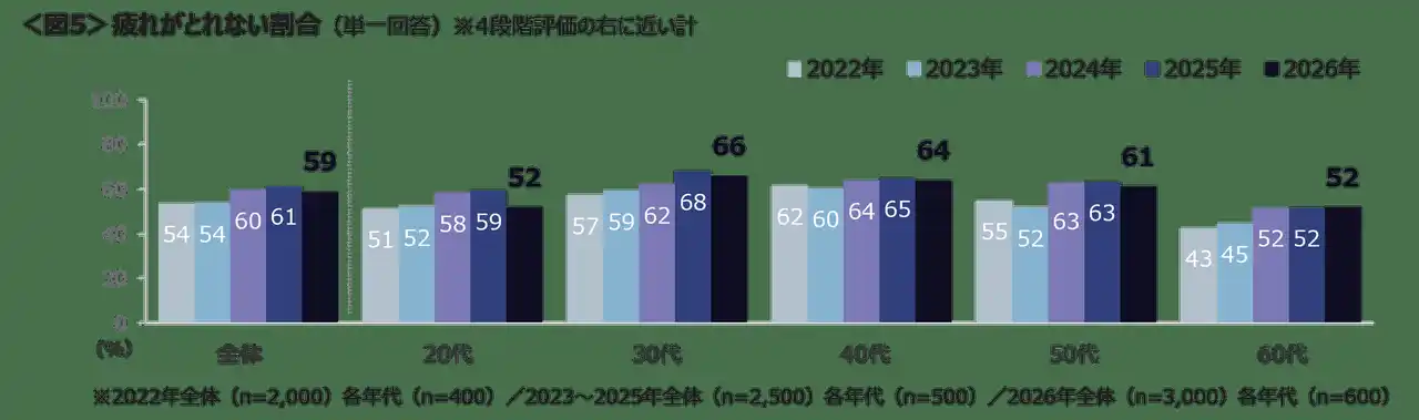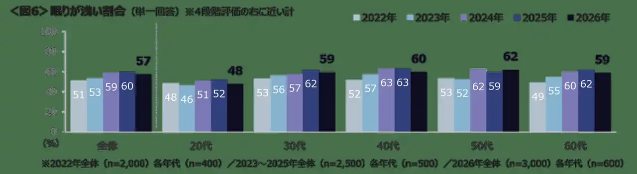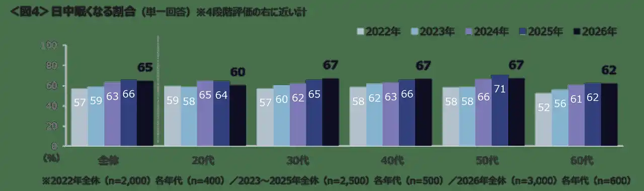 良好ではない睡眠状態を年代別見ると、「日中眠くなる」が30~50代、「疲れがとれない」は30~40代、「眠りが浅い」は50代で多い。「日中眠くなる」は30~40代において、2022年より増加傾向が続いている。<図4~6> |