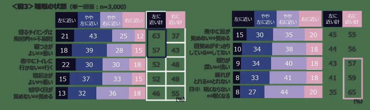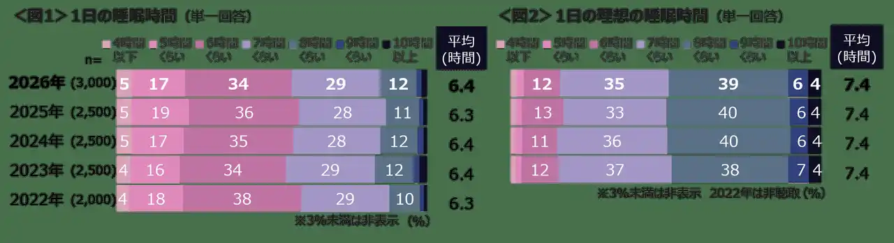 株式会社クロス・マーケティング(本社:東京都新宿区、代表取締役社長兼CEO:五十嵐 幹)は、全国47都道府県に居住する20~69歳の男女3,000人を対象に「睡眠に関する調査(2026年)」を実施しました。厚生労働省は2024年に改訂した「健康づくりのための睡眠ガイド2023」を公表しました。成人には「6時間以上の睡眠」を目安とし、日常的に質・量ともに十分な睡眠を確保することにより、心身の健康を保持し、生活の質を高めていくことを推奨しています。今回は実態編として、現在と理想の睡眠時間、睡眠の詳細な状態、睡眠時の悩みごと、眠りを妨げる悩みごと、普段寝るときに着ているものに着目し分析をしました。