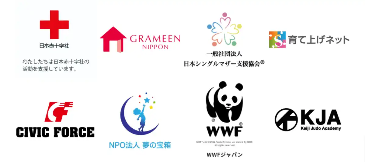 寄付先は日本赤十字社、グラミン日本、日本シングルマザー支援協会、育て上げネット、Civic Force、NPO法人夢の宝箱、WWFジャパン、KJAの8団体。累計寄付額は720万円を突破しています(2026年3月時点)。 |