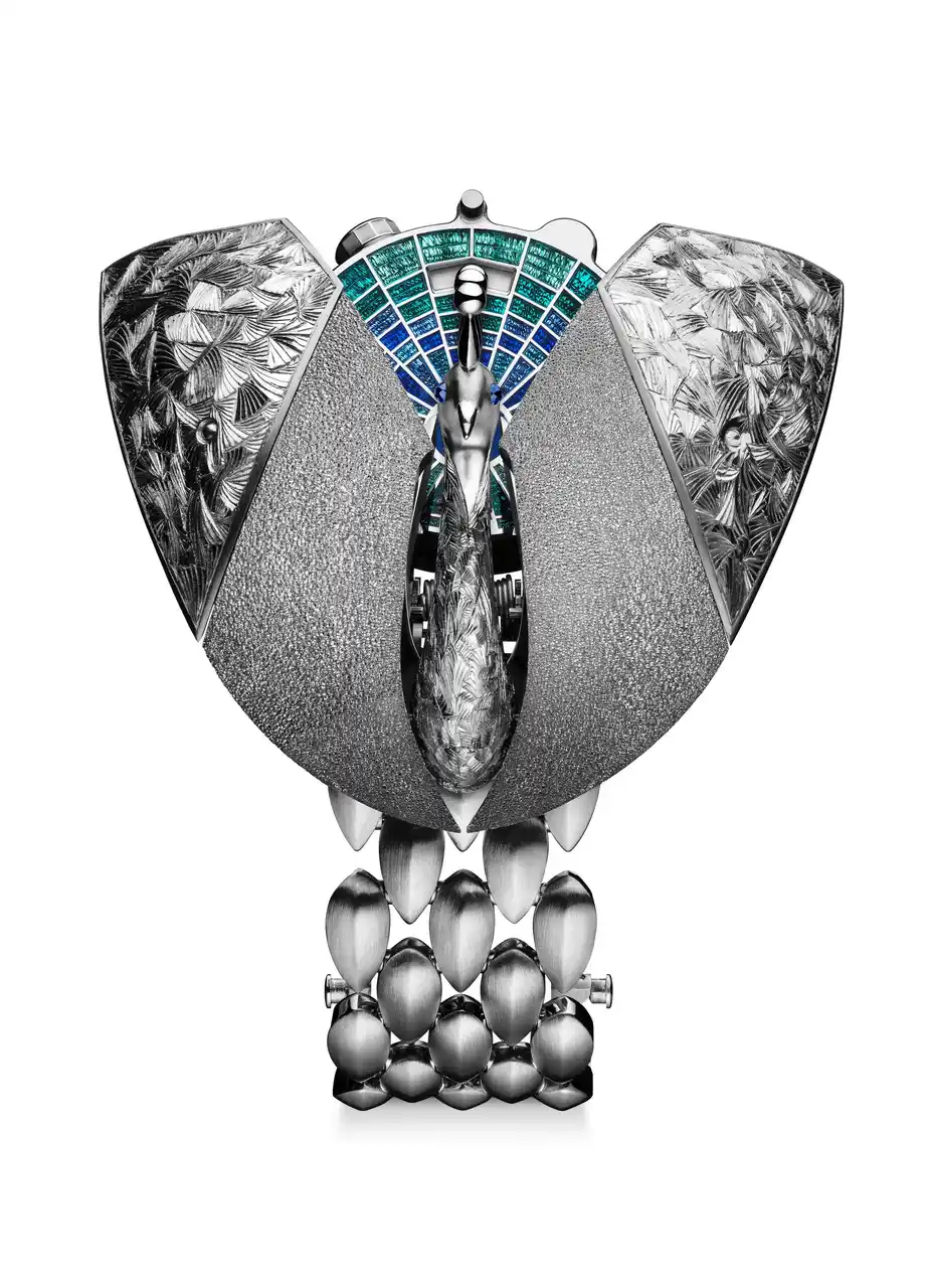 「エタブリスール ピーコック」はシークレットウォッチへのオマージュです。時計が閉じた状態では、美しいエングレービングを施したホワイトゴールドのかぶと虫のように見えますが、ワンプッシュすると羽根と頭が開き、ハンドクラフトのミニチュアの孔雀が現れます。そして繊細なハンドエングレービングを施した半透明なエナメルダイヤルが羽根の間に現れ、孔雀の尾となり、その名の通り華やかさを持つタイムピースです。ジュエラー、エナメル職人、エングレーバー、時計師らがそれぞれの技を持ち寄り、このタイムピースを完成させました。孔雀の目にはカラーストーンがセットされ、さらなる洗練を添えています。3種類のバリエーションが 2027年に登場する予定です。 |